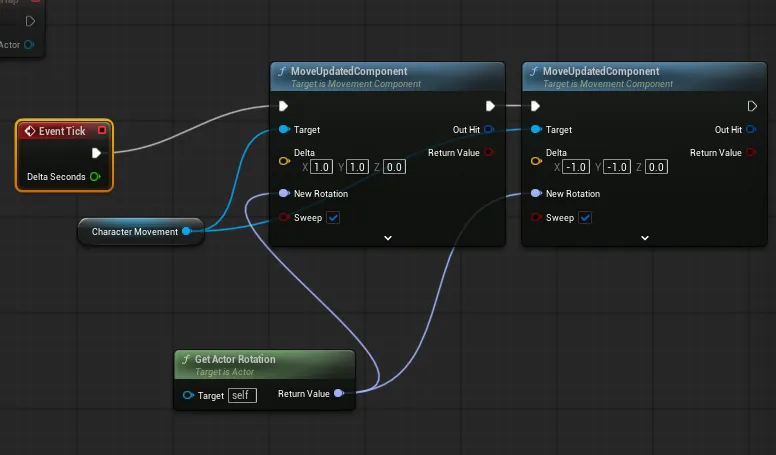 → [Event Tick → MoveUpdatedComponent(또는 AddActorWorldOffset)]를 호출해 캐릭터의 위치가 변하지 않아도 캐릭터를 이동 과정 중으로 넣어 충돌 검사를 강제로 돌릴 수 있다.